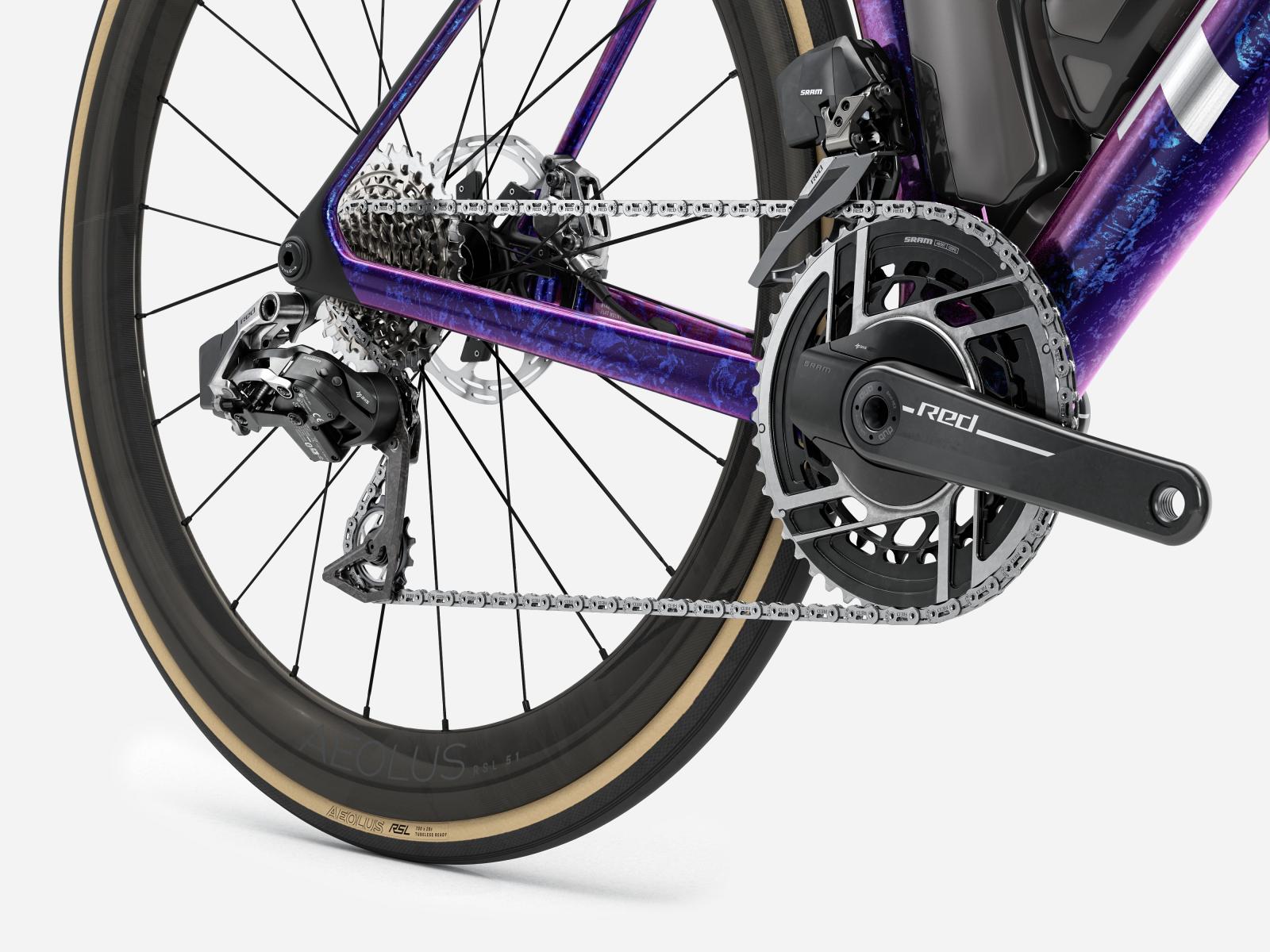 Einen unglaublich leichten, aerodynamisch optimierten Rahmen aus unserem besten 900 Series OCLV Carbon samt IsoFlow-Komforttechnologie und Watt-sparenden RSL Aero Trinkflaschen und Flaschenhaltern. Dazu gibts SRAMs neuesten ultraleichten RED AXS E1 Antrieb samt Powermeter f�r datengest�tzte Trainingsrunden, w�hrend das verbaute, weit verbreitete Universalschaltauge (UDH) die Ersatzteilbeschaffung erleichtert. Abgerundet wird die Ausstattung von schlauchlosen Bontrager Aeolus RSL 51 Carbonlaufr�dern und einer einteiligen Trek Aero RSL Lenker/Vorbau-Einheit.