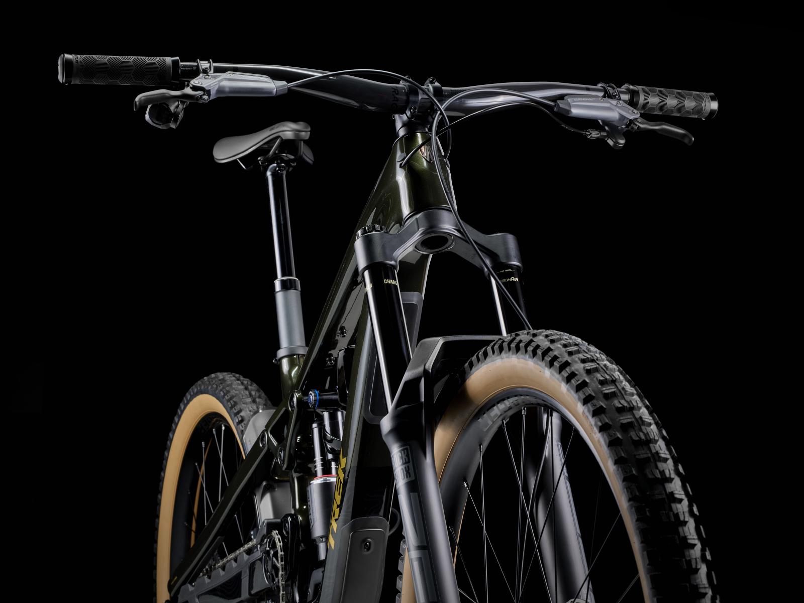 Einen Rahmen aus OCLV Mountain Carbon mit High-Pivot-Fahrwerkskonstruktion und Umlenkrolle sowie Rahmenstaufach. 170 mm vorderen und hinteren Federweg dank RockShox ZEB Select+ Federgabel mit DebonAir Federung und Charger 3.1 RC2 D�mpfung sowie RockShox Vivid Select+ D�mpfer. Au�erdem SRAMs drahtlose GX AXS Transmission mit breiter �bersetzung f�r knackige Anstiege, eine Bontrager Line Variosattelst�tze und eine Mullet-Laufradkonfiguration mit Bontrager Line Elite 30 Tubeless Ready 29er Vorderrad und 27,5 Zoll Hinterrad aus Carbon, inklusive Rapid Drive Nabe.