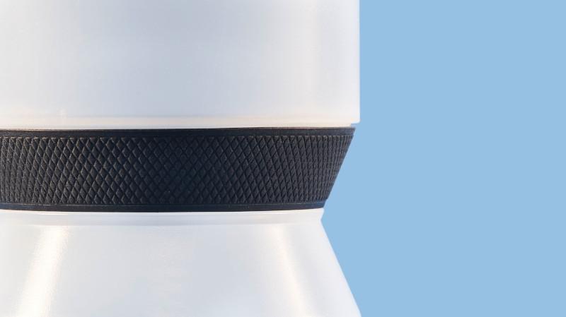 Mit seiner griffigen Struktur sorgt der No-Drop Griffring auch bei Nässe für festen Halt in der Hand.