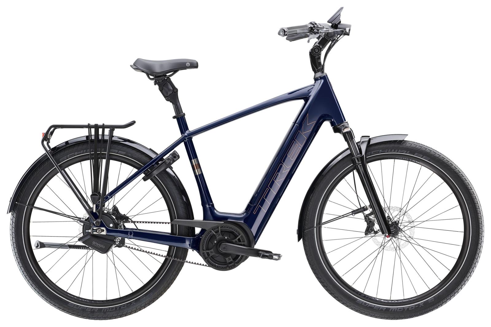 Einen Rahmen aus hydrogeformten Aluminiumrohren mit integriertem Akku und mit einer Federgabel, die über Schlaglöcher hinwegbügelt. Ein Gates CDX Riemenantrieb mit Enviolo Trekking Automatiq Getriebenabe übernimmt das Schalten für dich, und die Bosch Performance Line Cruise Smart System Antriebseinheit mit 250 W Leistung und 75 Nm Drehmoment unterstützt dich bis 25 km/h. Ein Kiox 500 Display mit Bluetooth-Konnektivität verbindet sich mit deinem Smartphone, während die Bosch BCM-Einheit den Diebstahlschutz erhöht. Die 4-Kolben-Scheibenbremsen bieten zuverlässige Bremsleistung und die Beleuchtung und der Gepäckträger garantieren