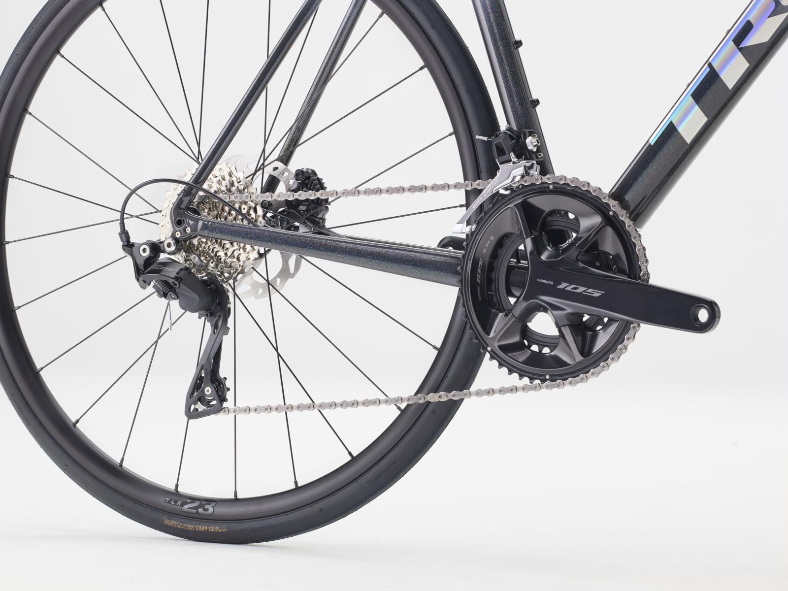 Einen ultraleichten Rahmen aus 300 Series Alpha Aluminium mit aerodynamisch optimierten Kammtail-Rohrprofilen und Invisible Weld Technology. Dazu gibts eine vibrationsdämpfende Émonda ARL Carbongabel, interne Zugführung an sowohl Rahmen als auch Gabel, eine Shimano 105 Komplettgruppe mit 2x12-Antrieb für präzise und zuverlässige Gangwechsel, kraftvoll zupackende hydraulische Flat Mount Scheibenbremsen und Tubeless-Ready-Laufräder.