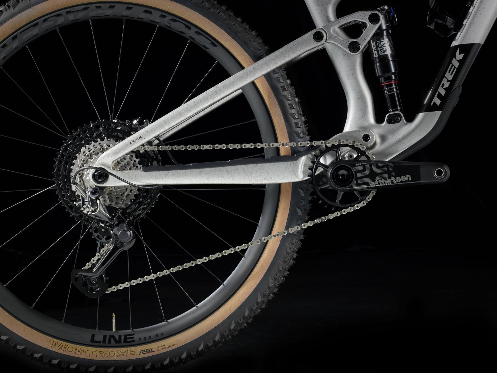 Einen Rahmen aus OCLV Mountain Carbon mit vierfach verstellbarem Mino Link an der unteren Dämpferaufnahme zur Feinanpassung der Rahmengeometrie und des Hebelverhältnisses des Fahrwerks. Eine RockShox Pike Ultimate Gabel mit 130 mm Federweg, DebonAir Luftfeder und Charger 3.1 RC2 Dämpfung sowie einen RockShox Deluxe Ultimate RCT Hinterbaudämpfer mit 120 mm Federweg. Eine Shimano XTR 12-Gang-Schaltung, hydraulische Shimano XTR M9100 Scheibenbremsen, eine Bontrager Line Variosattelstütze und Bontrager Line Pro 30 Tubeless-Ready-Laufräder runden das hochwertige Ausstattungspaket ab.